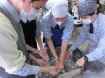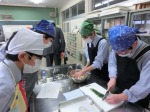 また第一学年の生徒たちは、一年間「総合的な学習の時間」の中で取り組んだ大豆栽培・加工体験学習の一環として、ゆでてつぶした大豆を具にした餃子づくりに挑戦しました。一年生にとっては高校生活最初の調理実習となりましたが、先輩や教員の助けもあり、時間内に調理、片付けすることができました。実習に臨んだ生徒からは、「うまく(餃子を)包めた」、「大豆の味がわかる」など、さまざまな声が聞かれました。
