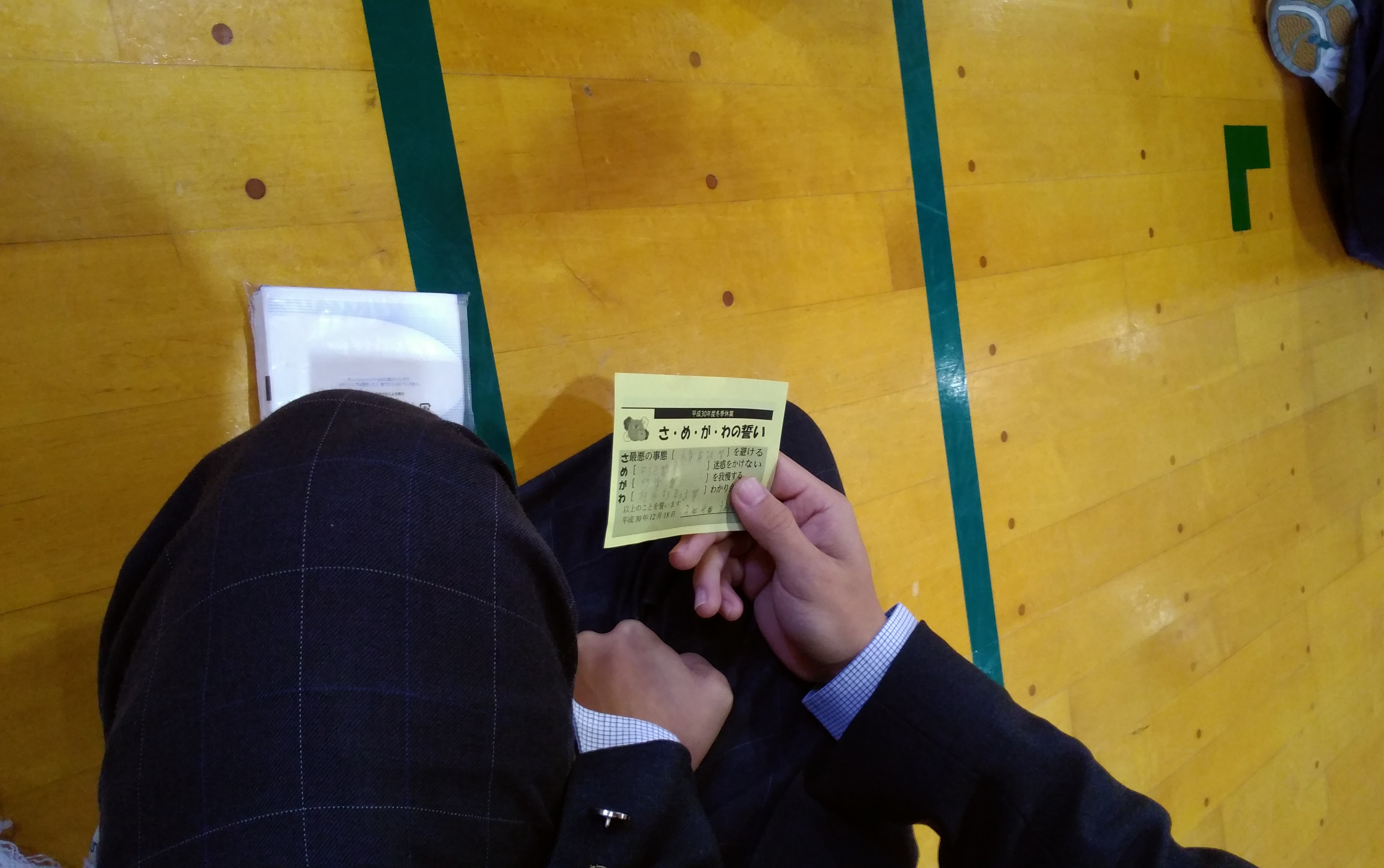 3月20日(水)、第3学期の終業式が行われました。校長先生の話に引き続き、生徒指導主事の進行のもと、各自が「さめがわの誓い」を立て、仲間と見せ合いました。