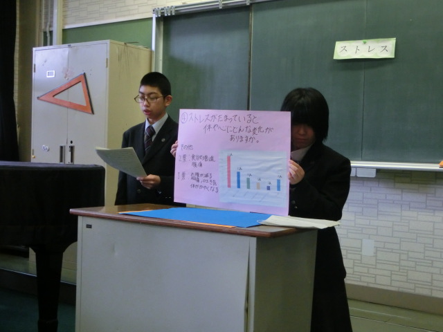 委員会の後半では、生徒保健委員による「ストレス」に関する発表が行われました。保健委員の生徒たちは、この日のために夏休み明けから全校生徒にアンケートを実施したり、スクールカウンセラーにインタビューしたりするなどの活動を行ってきました。生徒達はこれまでの活動の集大成として、緊張しながらも立派に発表することができました。
