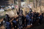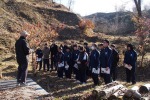(左から。一、二枚目、鈴木様の説明を受けています。三枚目、ドングリ捜索中。四枚目、鮫川村中心部を眺める生徒。)