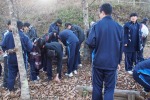 午後には学校から近隣の里山に場所を移し、「森林学習」と題して「大豆の先生」こと地元の農業、鈴木寛重様から、森と人とのかかわりについて教えていただきました。鈴木様からは、森は適度に人の手が入ることでより良い状態になっていくこと、山の木々が雨水をため込むことで洪水や土砂崩れを防ぐことができていること等について教えていただきました。里山を散策しながら、生徒たちは「ドングリ見つけました!」、「これはケヤキとスギの葉、どっちですか?」などと鈴木様に報告したり、質問したりしていました。