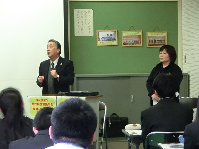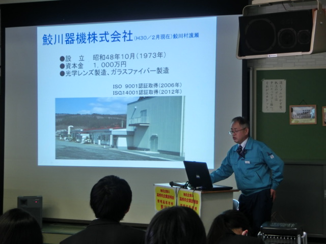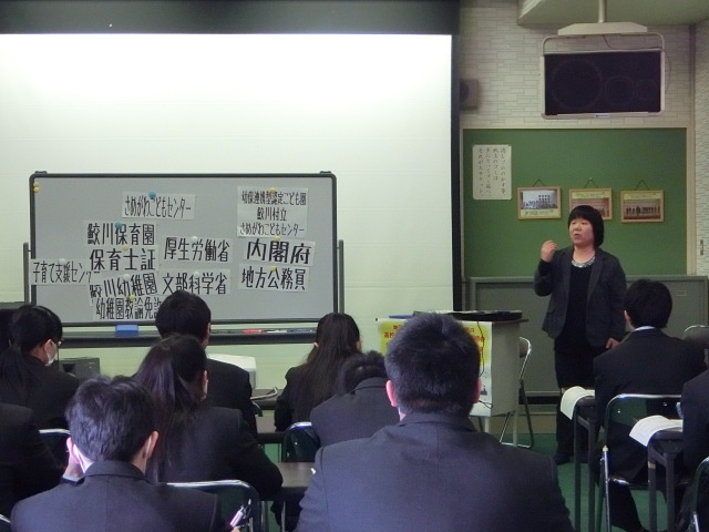 2月21日(水)に1・2年生を対象とした、ハローワーク主催の高校内企業説明会が行われました。今回は保育分野から「さめがわこどもセンター」様、製造分野から「鮫川器機株式会社」様、介護分野から「特別養護老人ホーム ほたるの里」様にお越しいただき、企業概要や企業が求める人物像、高校在学中に取り組むべきこと等についてお話しいただきました。