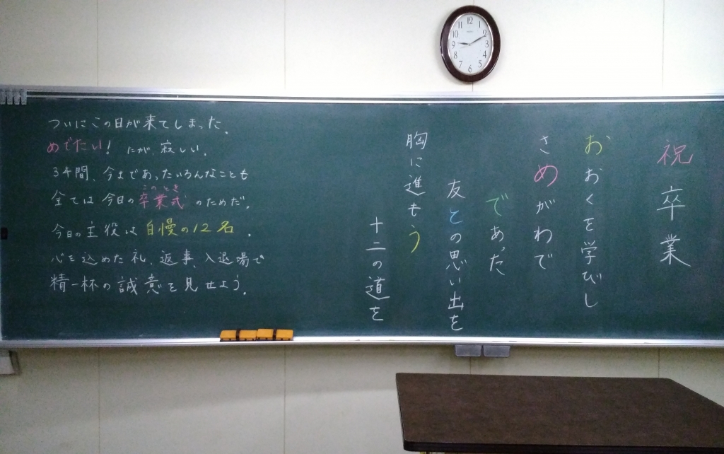 学級担任から12名の卒業生に向けた最後のメッセージが、黒板に記されていました。