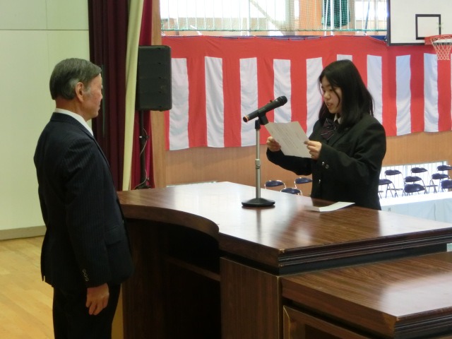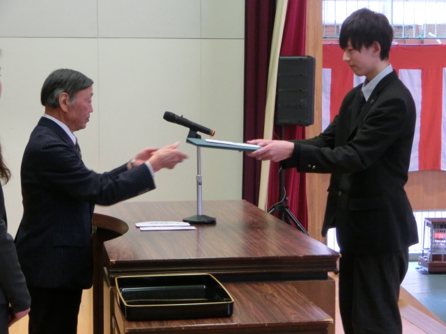 表彰式では、鷺野谷弘行同窓会長より、成績、生活両面で優秀な結果を残した生徒に「山峡(やまかい)賞」が、校長より「精勤賞」「生徒会功労賞」「ホームルーム功労賞」「学校活動功労賞」「成績優秀賞」がそれぞれの生徒に授与されました。同窓会入会式では、生徒の代表が「入会者宣誓」を行い、同窓会長より入会が許可されました。同窓会長からは、代表生徒に記念品が贈呈されました。