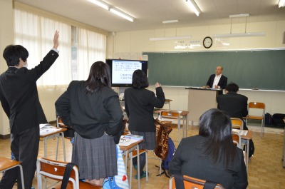 市川様からは「18歳選挙権について」と題し、「若い世代が選挙に行くこと」「新聞を読んで世の中の動きを知ること」の重要性をお話しいただきました。多くの3年生が選挙権をすでに持っていることもあり、生徒は熱心に耳を傾けていました。