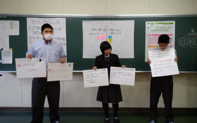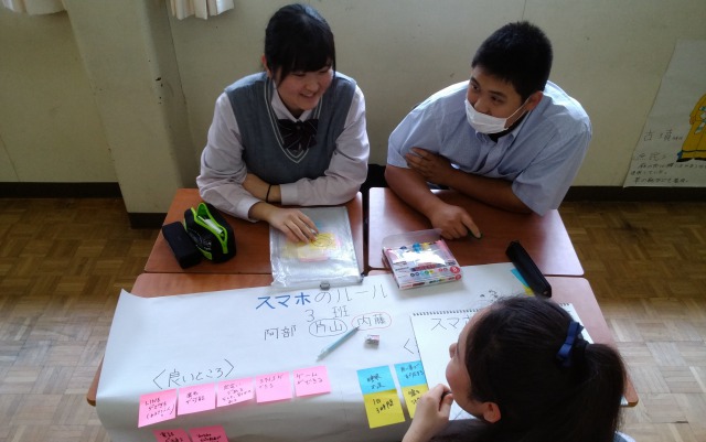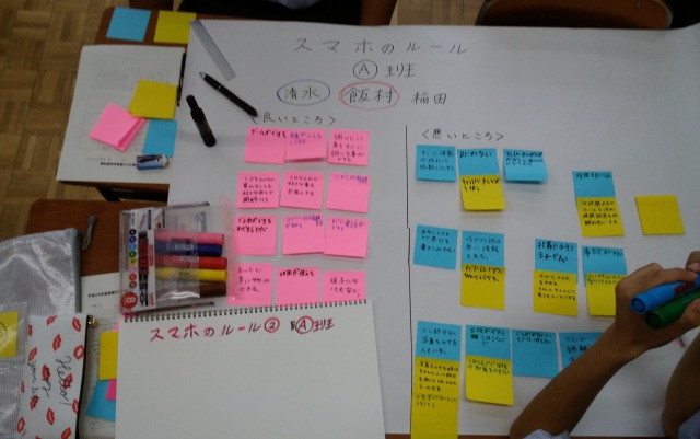 午前中の講演会に引き続き、午後はスマートフォンを使う上でのルール作りを班に分かれて行いました。